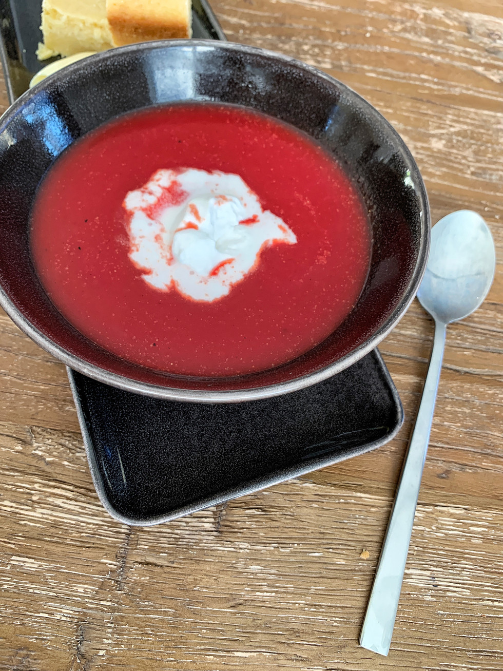 RAUÐRÓFUSÚPA M/ENGIFER OG TIMIAN, MEÐ ÞEYTTUM KÓKÓSRJÓMA OG MAÍSBRAUÐI. [vegan]